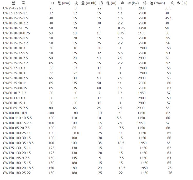 GW高(gāo)效管道(dào)排污泵性能(néng)參數(shù)